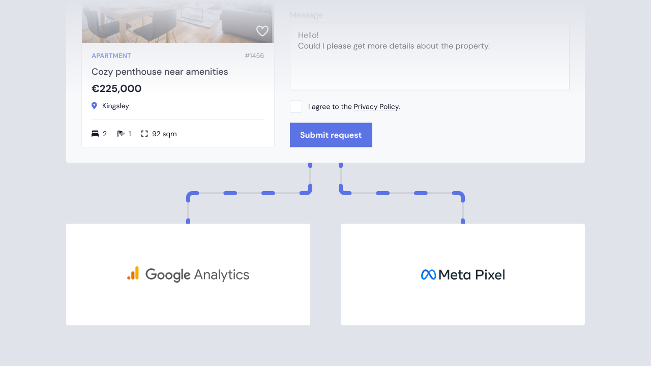 Estatebud Connect will automatically capture and dispatch tracking events. This occurs when a form is successfully submitted, and automatically includes valuable metadata, such as the currency and listing price.